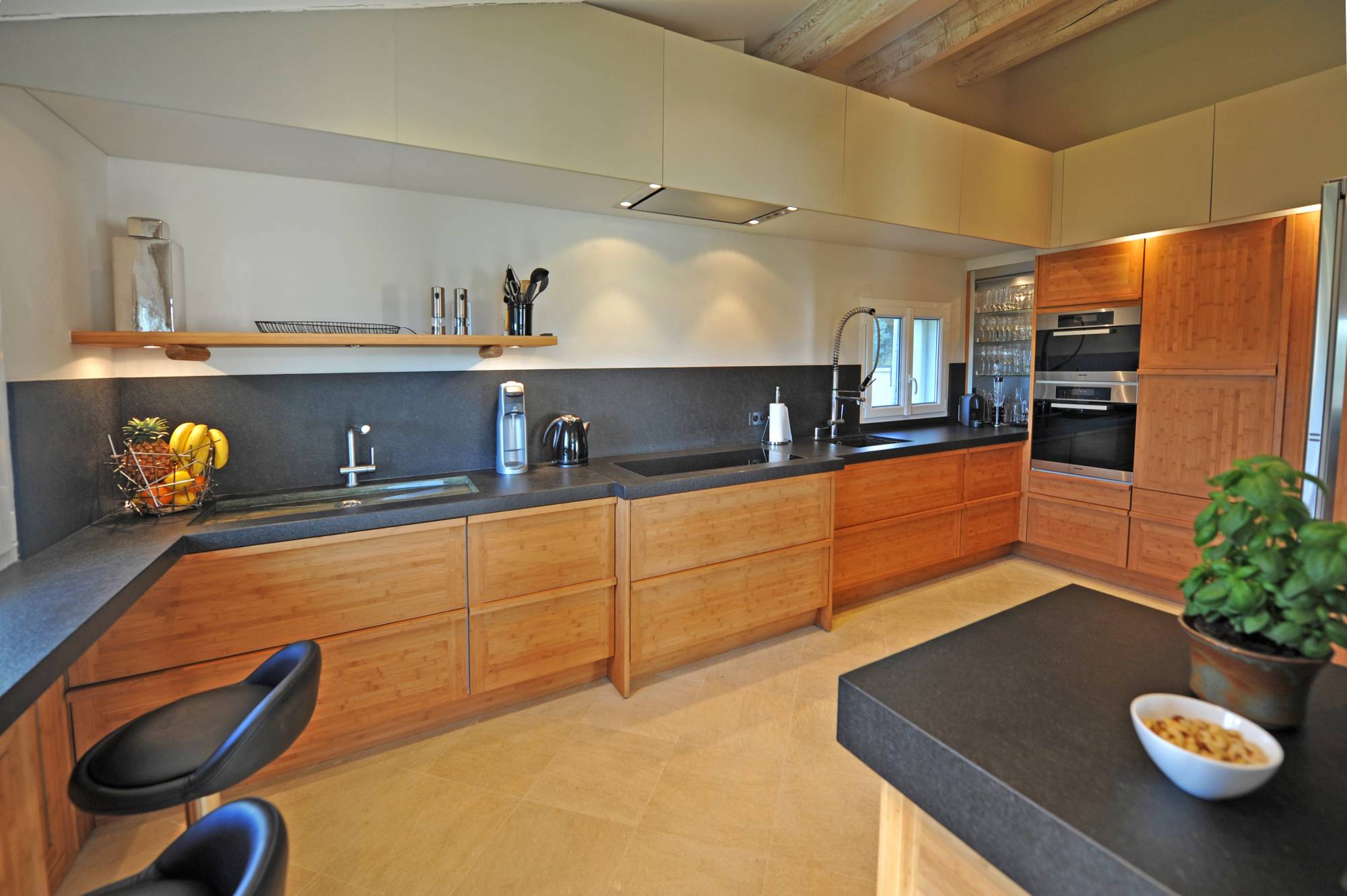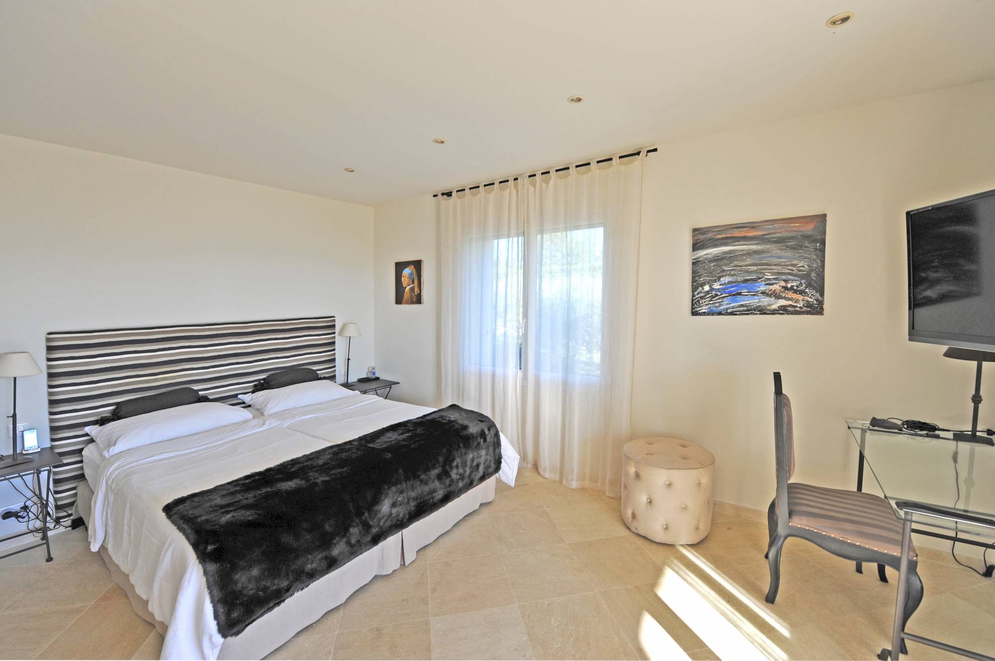 La maison comprend en rez-de-jardin : un hall avec une grande bibliothèque et un espace bureau avec accès internet, un salon avec TV, une salle à manger très lumineuse, une cuisine haut de gamme, très bien équipée, deux chambres avec dressing toutes les deux équipées d'un lit en 180 x 200 (2 sommiers, 2 matelas), salles d'eau et wc. L'une des salles d'eau est équipée d'un sauna.