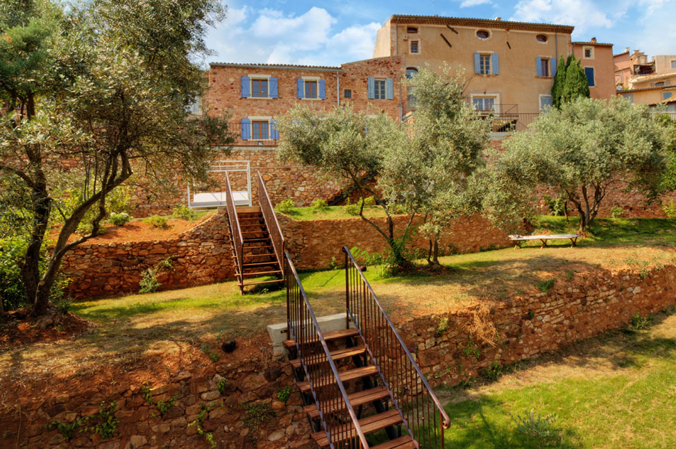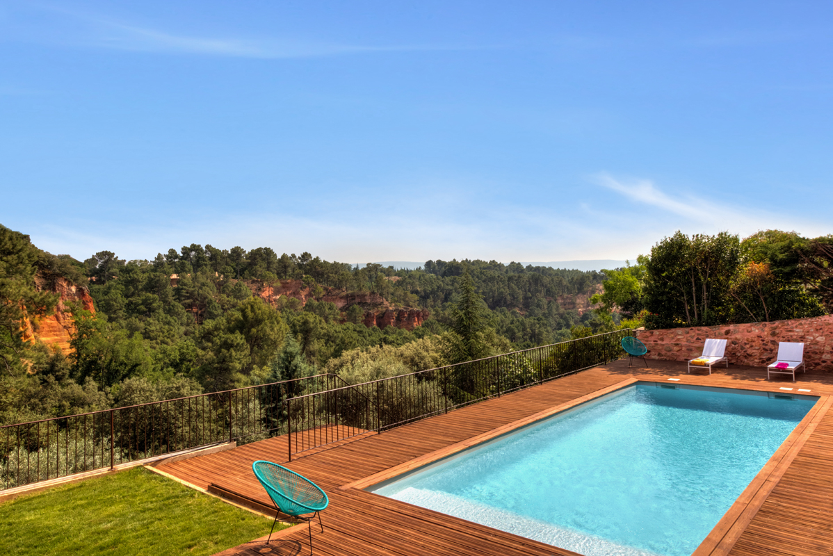 La terrasse profite d'une vue magnifique sur les Ocres de Roussillon.