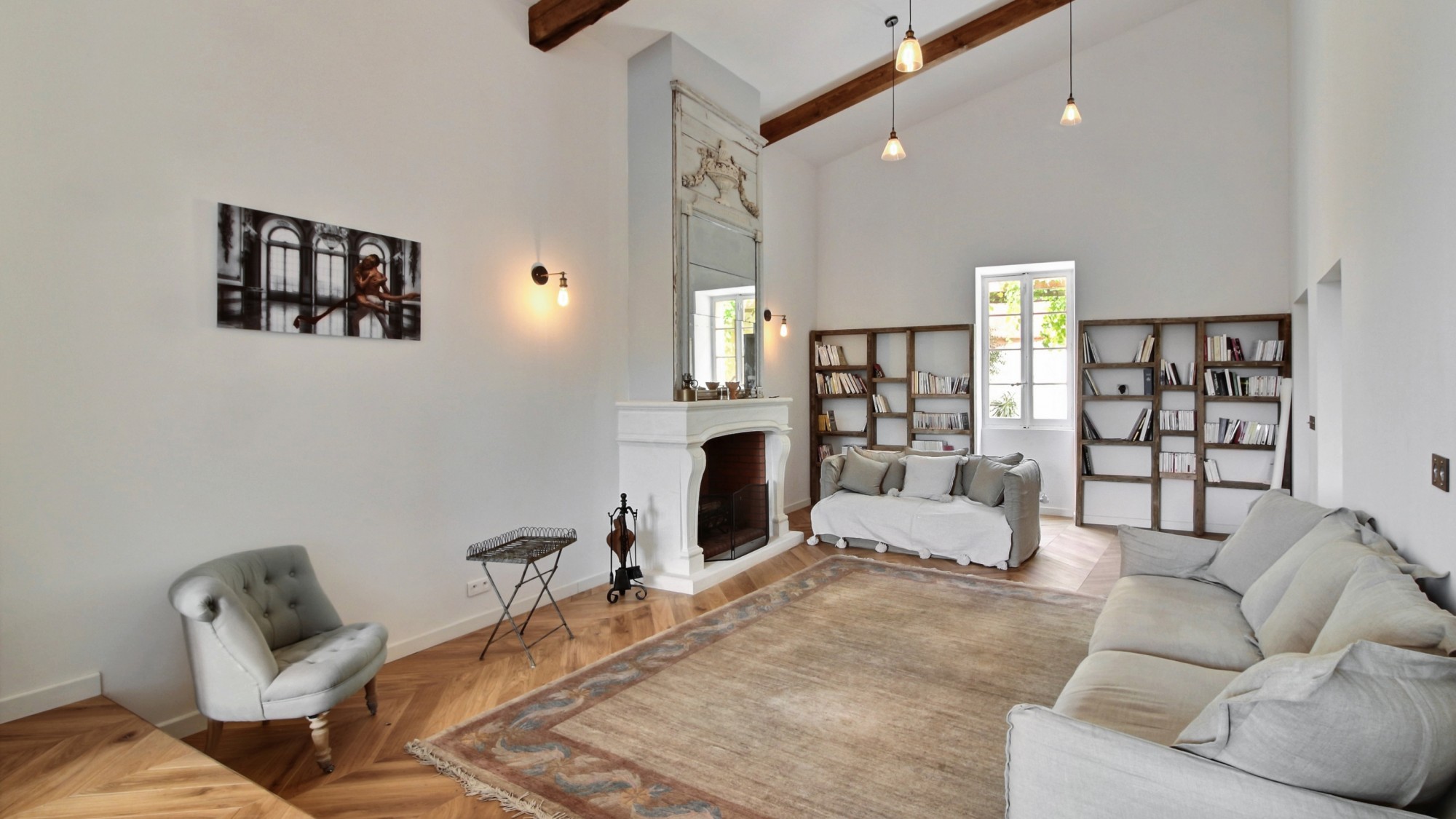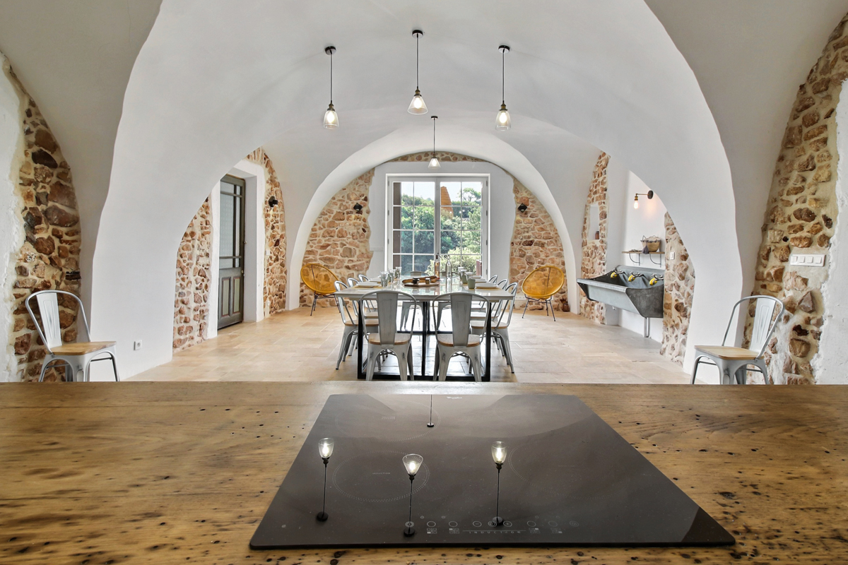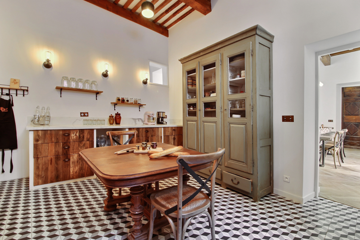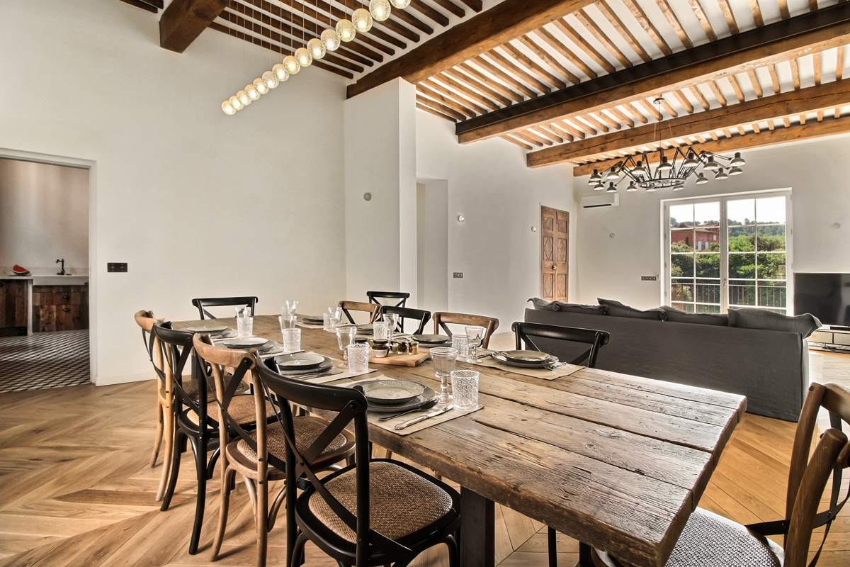 Sur la partie gauche de l’entrée, une vaste pièce composée d’un espace salle à manger et d’un coin salon avec TV donnant accès sur la terrasse, une cuisine entièrement équipée (réfrigérateur US, piano avec 3 fours, plaques à induction, lave-vaisselle, Nespresso…), un wc visiteurs.
